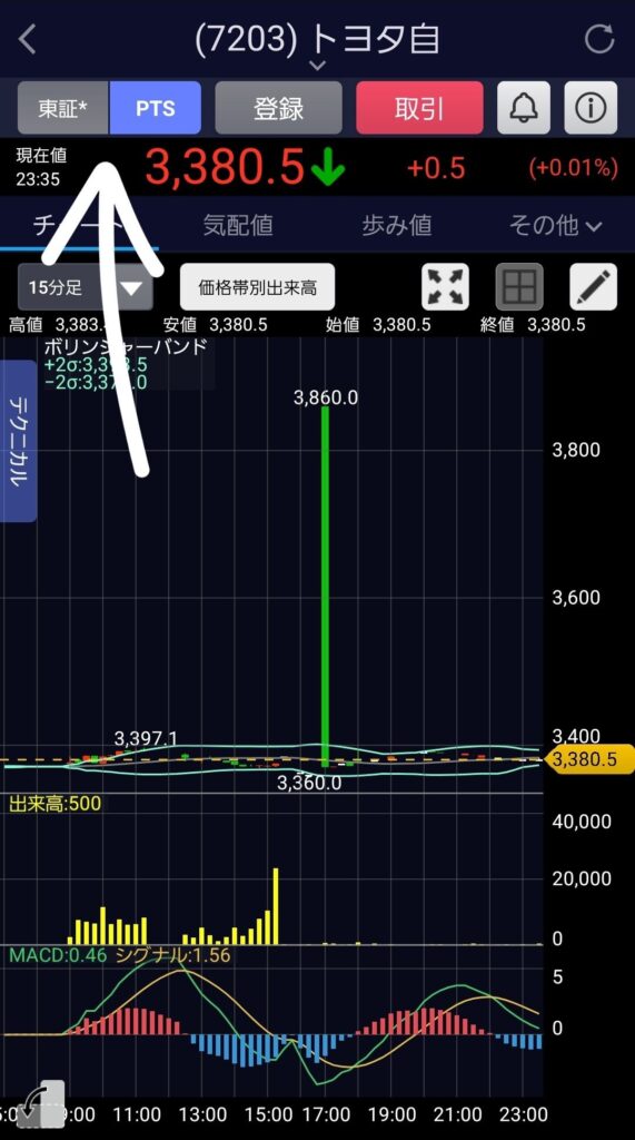 夜間のPTSの株価は、翌日の東証の「始値(はじめね:朝イチの値段)」の予想図になります。